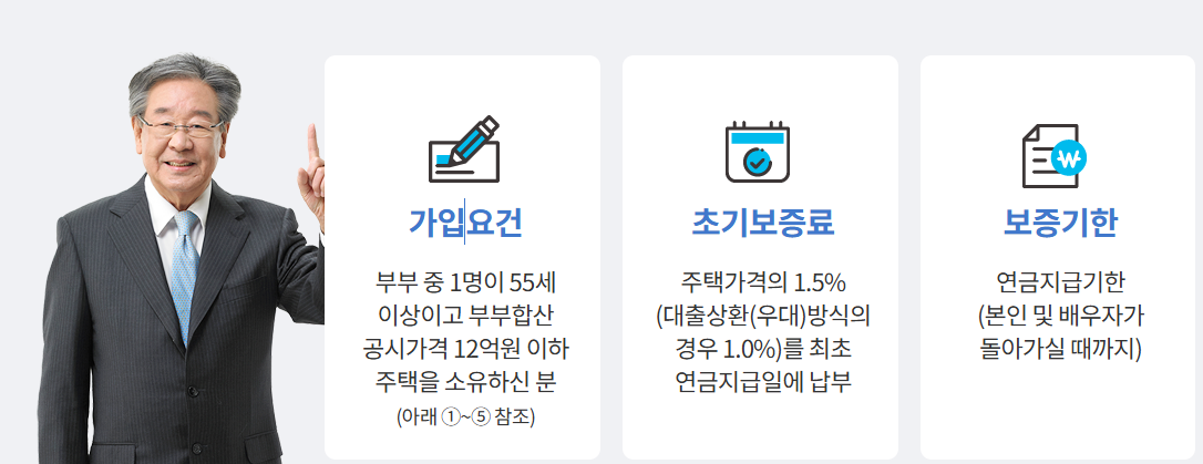 - 가입조건은 부부 중 1인 이상 55세 이상, 공시가격 합산 12억 원 이하 주택, 실제 거주 요건 충족