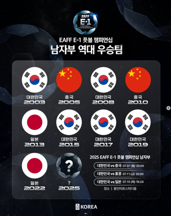 2025 동아시안컵 남자대표팀 경기는 모두 용인 미르스타디움에서 진행됩니다. 대한민국은 7월 7일 개막전을 시작으로 중국, 홍콩, 일본과 차례로 맞붙습니다.