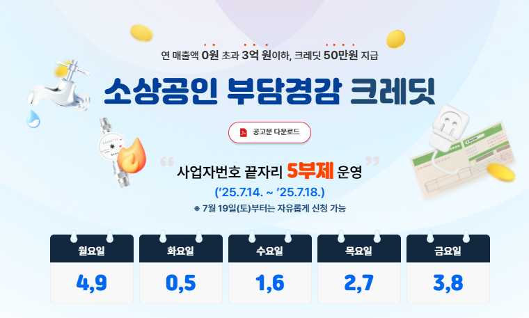 - 신청 기간은 2025년 7월 14일~11월 28일까지이며, 초기 5일간은 사업자등록번호 끝자리에 따라 5부제가 운영됩니다.