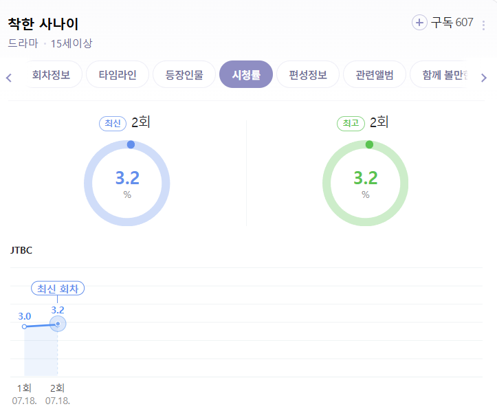〈착한 사나이〉는 2025년 7월 18일 첫 방송 당시, 전국 유료가구 기준 시청률 1회 3.0%, 2회 3.2%를 기록하며 안정적인 출발을 보였습니다. 이는 JTBC 금요극 편성 중 준수한 수치이며, 작품성에 비해 다소 보수적인 반응이라는 평가도 있었습니다.