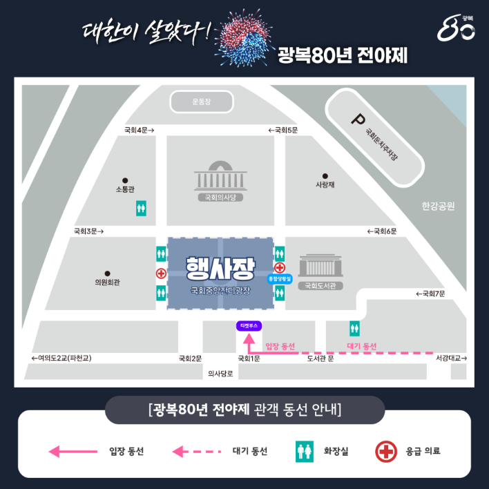 ‘대한이 살았다’ 전야제 공연은 국회의사당 앞 대규모 야외 무대에서 진행되는 만큼, 사전 준비와 현장 유의사항을 꼭 확인하는 것이 좋습니다. 무료 공연이지만 인파가 몰릴 수 있어, 입장 시간·교통수단·물품 준비 등을 사전에 체크하는 것이 관람의 질을 높입니다.